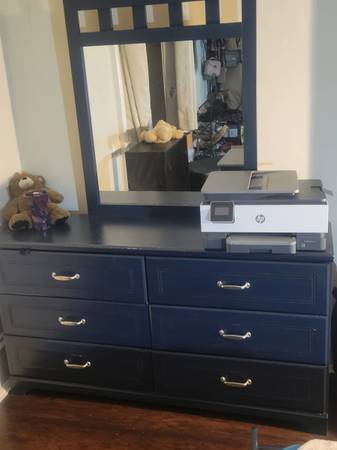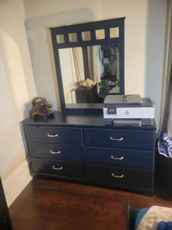 Navy blue Ashley furniture full size trundle bed with matching 6 drawer dresser with mirror. In good condition with just normal wear. Not missing any pieces and from a smoke free and bug free household. I do not have the instruction manual anymore but it can be found online. $100.00 OBO. Will deliver locally for an additional $25.00.