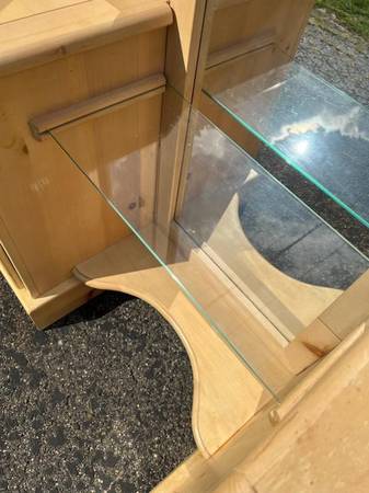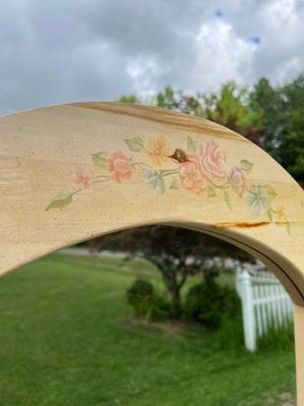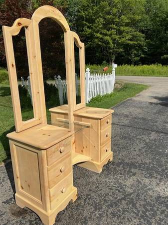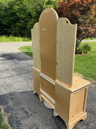 Unique light blonde wood vanity with triple mirrors. Excellent condition. Floral decor accent, as shown. 3 panel movable mirror assembly. Measures 72" H x 49" W x 18" D. See diagram. Originally...