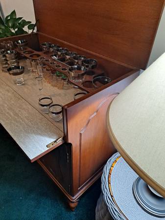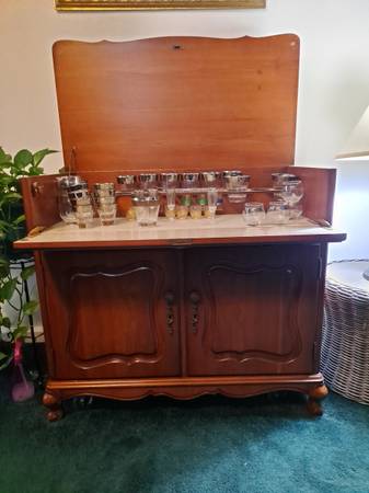 Cherry wood with glass ware and glass on top. Very good condition. OBO