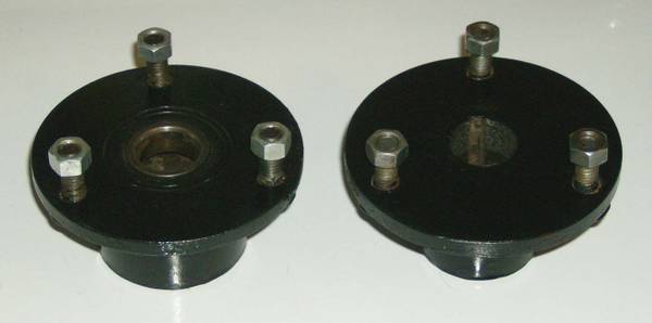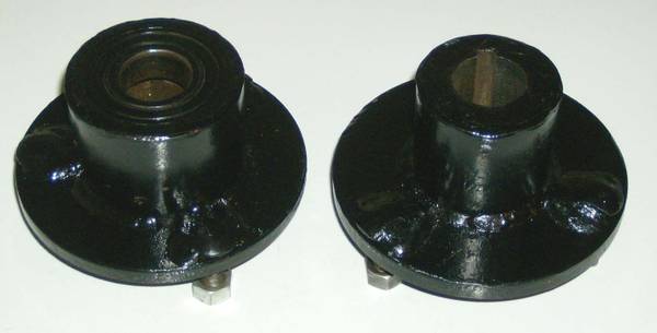 Set of used wheel hubs to fit a keyed 1" axle, one with bearings and the other is the drive hub both with 3" CTC lug bolt spacing. Measures 2&1/4" deep on the drive hub and 2" on the bearing side. Studs are 3/8" course. Key way is ¼".