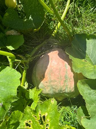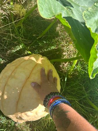 These are some squashes that mysteriously appeared out of our compost so we don’t know exactly what squash we put in there. They are eight dollars each and they’re bigger than a basketball.